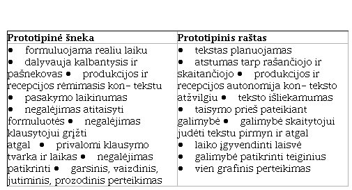 Šis kontinuumas susideda iš ištisos gamos tarpinių atmainų ir ypač gausu tų, kurios yra realizuojamos šneka, tačiau neturi tų spontaninei šnekai (kuri vyksta dalyvaujant abiem pašnekovams, iš anksto neparuošta, nei žinant, kad yra įrašinėjami) būdingų savybių. Be jau minėtų formalumo aspektų, galima kalbėti ir apie per papildomą kanalą perduodamą kalbą (it. trasmesso), kuriai būdinga „užrašytos šnekos“ ir „ištarto rašto“ savybės. Šias atmainas galima apibūdinti kaip hibridines, nes jose konkuruoja tipiški šnekos ir rašto bruožai. Ištarto rašto porūšiais galėtume laikyti ypač medijų – kino, radijo, televizijos – kalbą, o užrašytos šnekos pavyzdžiai galėtų būti komunikacija internetu (pvz., elektro- niniai laiškai, blogai) ar telefonu (SMS, įvairios „chat“ tipo programos). Visiems šiems per papildomą – tarsi trečią – kanalą perduodamiems tekstams bendros savybės yra tai, kad perdavimas vyksta skirtingoje fizinėje erdvėje nuo pašnekovo ir tos pačios žinios perdavimas daugeliui adresatų, jis skiriasi nuo realios šnekos ir tam tikra prasme įgauna pusiau oficialų statusą (Sobrero, Miglietta 2006, 121; Sabatini 1984).