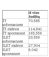 Apie per papildomą kanalą perduodamą kalbą, šiuo atveju – žiniasklaidos kalbą, verta pakalbėti atskirai. Žiniasklaidos tekstyne (ŽT), kaip minėta, esama įvairaus tipo laidų, kurios priskirtos atitinkamam tipui. Pagal tokius tipus buvo suklasifikuoti ir žiniasklaidos kalbos duomenys iš SLKT, nors, suprantama, jų apimtis gerokai mažesnė nei ŽT. 2 lentelėje ir 4 paveiksle pateikiami duomenys apie žiniasklaidos kalbą šiuose dviejuose tekstynuose pagal apimtį (žodžių skaičių) ir vartojamus įvardžių variantus. Galima pastebėti, kad SLKT duomenys net ir informacinėse laidose daug labiau artėja prie jau aptartos spontaninės kalbos. Viena iš priežasčių galėtų būti ta, kad ypač informacinės šio tekstyno laidos yra buvusios transliuotos ne nacionalinių, o regioninių (Klaipėdos, Kauno) žiniasklaidos priemonių. Tuo tarpu ŽT informacinės laidos (jų ypač gausu iš sovietinio laikotarpio., o dabartinio laikotarpio laidos yra iš nacionalinės aprėpties kanalų) labai priartėja prie rašto kalbos įvardžių vartojimo proporcijų atžvilgiu.