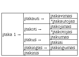 Abundancy of systemic examples of derivative verbs with the suffix -oti shows that the neologism įtakoti are in the same group with pasakoti and sąlygoti . They are prefixal verbs, i.e., derivatives with the suffix -oti from prefixal deverbative nouns: įtekėti → įtaka → įtakoti; nuimti → nuoma → nuomoti; pasekti → pasaka → pasakoti; pravežti → pravėža → pravėžoti; sulygti → sąlyga → sąlygoti. Therefore, correction of the verb įtakoti is not justified from the perspective of systemic word derivation If įtaka is generally regarded as a part of derivational system of the Lithuanian language (and this is true, because it is a submorphemic loan translation, europeism, book neologism, although structurally successfully matching with examples of productive derivation models and likely to be influenced by analogous processes), its functioning in the Lithuanian language does not differ from other a -stem nouns – the derivational model of suffix -oti from the a -stem is abundant. The derivatives with this suffix are frequently derived from base nouns as well as from deverbatives, sometimes even from prefixal or concrete or even abstract nouns; the meaning of derivation does not fall out of the context here. Names of persons with the suffix -tojas are formed in big numbers and a systemic way from derivatives with the suffix -oti and with the root of verb – pasakotojas, sąlygotojas, nuomotojas, pravėžotojas, įtakotojas .