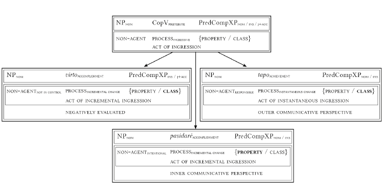 JK su pasidarė ir JK su tapo, kaip matėme, turi kalbos raidoje nusistovėjusias savo designacijos zonas, tačiau jų veiksmažodžių galimo tarpusavio sukeičiamumo mastas (per abi konstrukcijas vidutiniškai 14,3 proc.) yra pakankamas, kad jas galėtume laikyti kalbos vartotojo sąmonėje egzistuojančios bendresnės ingresyvinio aspekto raiškos konstrukcijos dviem atskiromis instanciacijomis. Adaptavę konstrukcijų gramatikos schemas (Croft 2001, 18; Petré 2012, 29–32; plg. Mikulskas 2018, 7–9) visų trijų konstrukcijų tarpusavio santykius formaliai galime pavaizduoti taip: