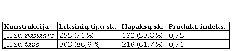 Toliau palyginimui pateikiami abiejų aptariamų jungčių leksinių komplementų tipų, ir hapaksų skaičiai, atspindintys jų konstrukcijų produktyvumą, kiek apie jį galima spręsti iš tirtos ribotos DLKT imties. Bendras jungties pasidarė komplementų atvejų skaičius 300 vienkartinės imties eilučių — 357. Iš jų leksinių tipų priskaičiuota 255, arba 71 proc. bendro atvejų skaičiaus; hapaksų — 192, arba 53,8 proc. bendro atvejų skaičiaus; produktyvumo indeksas — 192 : 255 = 0,75. Bendras jungties tapo komplementų atvejų skaičius 300 vienkartinės imties eilučių — 350. Iš jų leksinių tipų priskaičiuota 303, arba 86,6 proc. bendro atvejų skaičiaus; hapaksų — 216, arba 61,7 proc. bendro atvejų skaičiaus; produktyvumo indeksas — 216 : 303 = 0,71. Patogumo dėlei šie skaičiai tolia pateikiami 5 lentelėje: