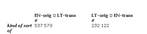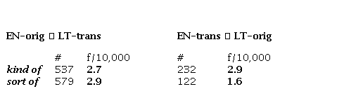 In order to generate concordance lines with the type nouns kind of and sort of as well as their translations, the multilingual concordancer ParaConc (Barlow 1995) was used. The corpus output files in the plain text format were imported into an Excel spreadsheet for further analysis. The search was bidirectional: first, kind of and sort of were searched as nodes in the EN-orig LT-trans direction; second, they were entered as nodes in the EN-trans LT-orig search direction. Table 2 shows the raw frequency of the items under investigation: