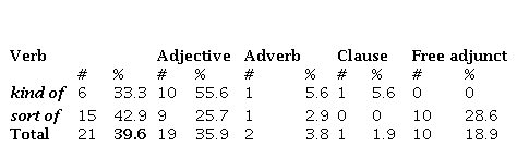As seen from Table 4, the type nouns modified verbs most frequently, adjectives taking the second place. The findings are in line with Aijmer (2002). Her results demonstrated that, for example, sort of “was especially frequent before NP (42.1 %) and before VP (36 %)” (Aijmer 2002, 183). The cases were the type noun featured as a stand-alone marker exclusively appeared with sort of only, which might imply that “<...> kind of strongly prefers to modify nouns and adjectives while sort of strongly prefers to modify whole propositions, adverbs and verbs” (Gries, David 2007).