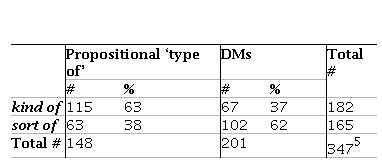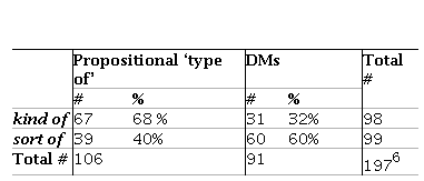 The results show kind of and sort of are prone to be used NP-internally; however, even in this construction they can feature as DMs. Kind of and sort of function as unambiguous DMs when they completely lose their nominality, i.e. are used NP-externally. Sort of conveyed pragmatic meanings more often than kind of in both sub-corpora, whereas kind of was more frequently used propositionally to indicate a type.