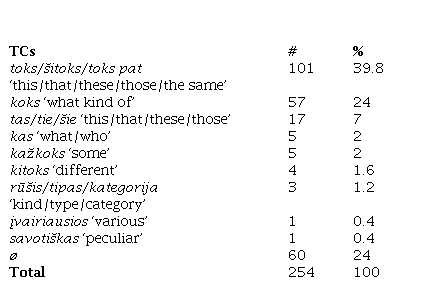The functional and semantic potential of the type nouns is fully reflected by their TCs. Very rarely kind of and sort of are translated congruently into a type noun (rūšis ‘kind’, kategorija ‘category’ and tipas ‘type’); even though they denote a type and are used propositionally, they usually correspond to demonstrative pronouns such as tie/šie ‘those/these’ and toks/šitoks ‘such’ in Lithuanian.