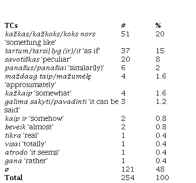 A great variety of TCs reveal the multifunctional nature of the two items in question. Naturally, the translational correspondences of the two DMs could not be congruent. The divergent TCs included a variety of words, such as kažkoks/koks nors ‘something like’ (20 %), tartum/tarsi, lyg (ir) and it ‘as if’ (15 %), savotiškas ‘peculiar’ (8 %). The other various TCs make up (9.6 %).