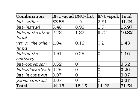 While GC-GC combinations have been found to dominate in spoken discourse, the frequency and distribution of GC-SC combinations shows the opposite, as spoken discourse contains the least amount of GC-SC combinations. Moreover, the highest number of GC-SC combinations is detected in academic discourse, due to frequent but-rather combinations.