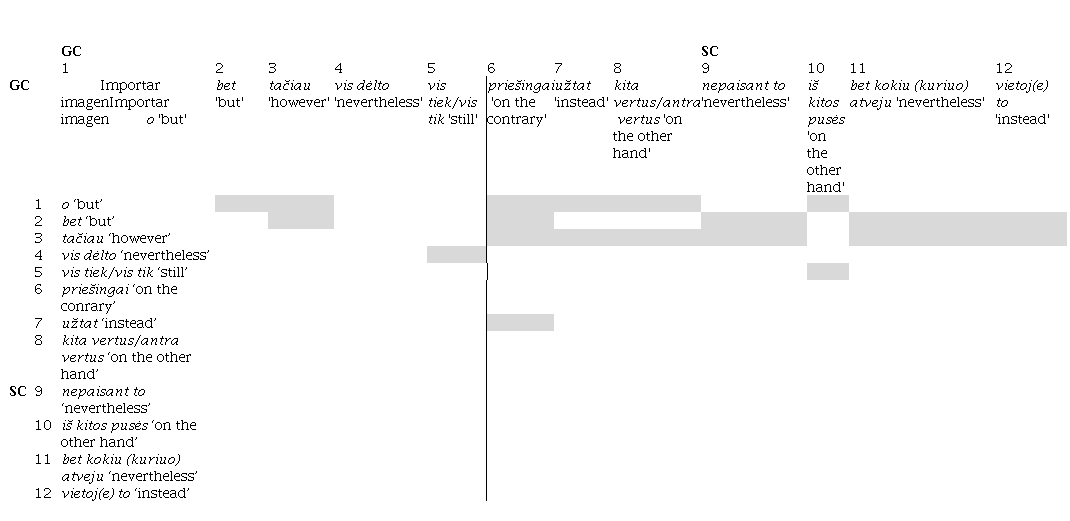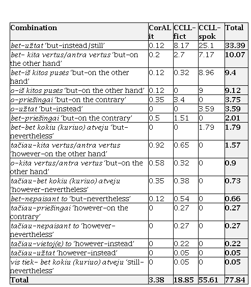 As Table 10 illustrates, the most prevailing GC-SC combinations are headed by a CDM bet ‘but’. The most frequent GC-SC combinations in the Lithuanian corpora are bet-užtat ‘but-instead’, bet- kita vertus/antra vertus ‘but-on the other hand’ and bet-iš kitos pusės ‘but-on the other hand’.