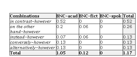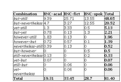 The results obtained are in line with the findings in Fraser (2013), who claims that the only SC-GC combinations are the ones with however in the final position of a combination. However combines with all SCs, except for rather and on the contrary. SC-GC combinations make up the bulk of all combinations in academic discourse. Few instances of SC-GC combinations have been found in fiction and no instances of these combinations have been attested in spoken discourse.