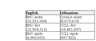 Three corpora were used in the study. Written Lithuanian data was selected from the sub-corpus of fiction in the Corpus of the Contemporary Lithuanian Language (CCLL-fict). The specialized synchronic corpus of written academic Lithuanian CorALit (Corpus of Academic Lithuanian) served as a source for written academic language. Spoken Lithuanian was extracted from the sub-corpus of spoken discourse in the CCLL (CCLL-spok). Data for written and spoken English was retrieved from the British National Corpus (BNC), namely the sub-corpora of fiction, academic and spoken discourse. The size of each data source employed for the identification of the combinatory potential of CDMs in English and Lithuanian is provided in Table 1.