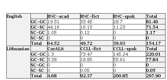 Lithuanian GC-SC combinations are mainly detected in spoken discourse. On the other hand, fiction contains the widest variety of different GC-SC combinations.