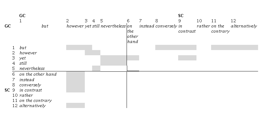 GC-SC combinations in the English data are mostly headed by a CDM but. The most frequent GC- SC combinations in English are but-rather/instead/on the other hand; the least frequent combinations are but/yet-in contrast.
