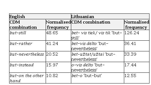 The first feature emerging from Tables 3-4 is the ranging frequency and variety of CDM combinations in the English and Lithuanian data. The most frequent CDM combinations in Lithuanian are bet- vis tiek/ vis tik‘but-still’, bet-vis dėlto ‘but-nevertheless’, bet-užtat ‘but-instead’, o-vis dėlto ‘but-nevertheless’ and bet-o ‘but-still’; and the most frequent CDM combinations in English include but-still, but-rather, but-nevertheless, but-instead, but-on the other hand (Table 5).