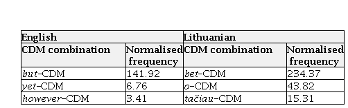 Lithuanian bet-CDM ‘but-CDM’ and English but-CDM combinations display the highest frequencies and functional variation. Both bet ‘but’ and but combine with all the other CDMs under investigation. Bet-CDM ‘but-CDM’ combinations are most common in spoken discourse, while but-CDM combinations prevail in academic discourse. The most frequent CDM combinations in Lithuanian are bet-vis tiek/ vis tik‘but-still’, bet-vis dėlto ‘but-nevertheless’, bet-užtat ‘but-instead’, o-vis dėlto ‘but-nevertheless’ and bet-o ‘but-but’, whereas but-still, but-rather, but-nevertheless, but- instead and but-on the other hand prevail in English.