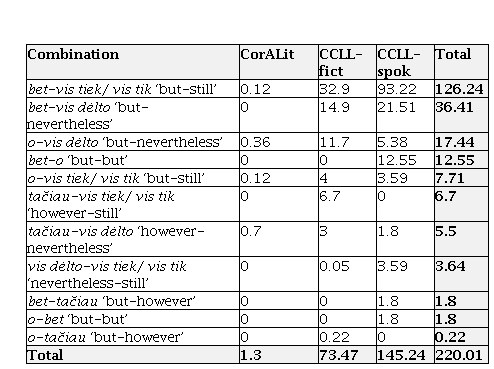 The normalized frequencies of CDM combinations (see Table 2 below) show their predominant use in the Lithuanian language: