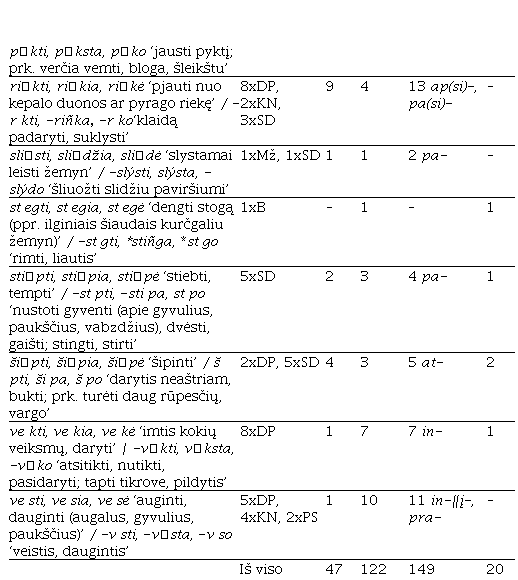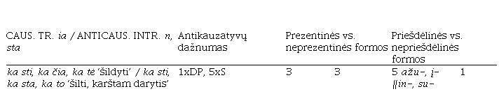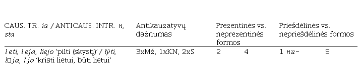 1–8 lentelėse atsispindi antikauzatyvų vartosenos polinkiai – dominuoja neprezentinės priešdėlinės formos: neprezentinės formos sudaro apie 70 procentų, o priešdėlinės – net apie 80–90 procentų senuosiuose raštuose užfiksuotų formų (žr. 9 lentelę).