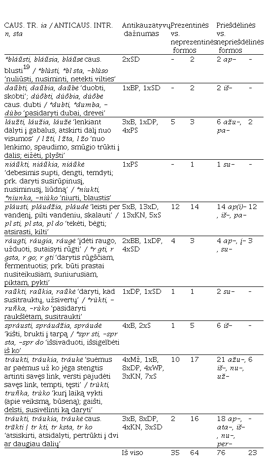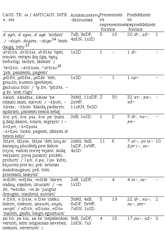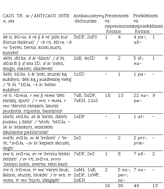 Tiriamuosiuose senuosiuose raštuose užfiksuotos 59 kauzatyvų / antikauzatyvų opozicijos10 (plg.: visame lietuvių kalbos plote, LKŽ ir LKŽ kartotekos duomenimis, tokių porų fiksuojama apie 200, žr. Pakalniškienė 1993; 1996, 83–86; dabartinėje lietuvių kalboje – apie 50, žr. Arkadiev 2013). Nagrinėjamosios leksemos yra apofoniškai aktyvios: kauzatyvai turi pagrindinio, antikauzatyvai nykstamojo laipsnio šaknis. Tačiau ne visos balsiokaitos eilės yra vienodai produktyvios. Gausiausias grupes sudaro dvibalsinės CeiC- / CC- (16) ir dvigarsinės CeRC- / CiRC- (15) šaknies vokalizmo opozicijos, kiek mažiau fiksuojama CauC- / CC- (10), CeR- / CiR- (8) apofonijos realizacijų. Periferiją sudaro balsinės CeC- / CC- (5) bei dvibalsinės Cau- / Cu- (3), Cei- / Ci- (1) tipo opozicijos. Užfiksuota vienintelė neapofoninė opozicija. 1–8-oje lentelėse11 pateikiamos senuosiuose raštuose užfiksuotos dekauzatyvinės opozicijos, sugrupuotos pagal balsių kaitą ir produktyvumą, nurodant antikauzatyvų pavartojimo dažnį12, prezentinių ir neprezentinių formų bei priešdėlinių ir nepriešdėlinių formų santykį.