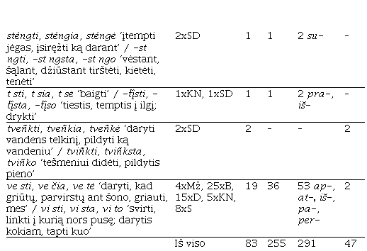 Straipsnyje pristatomas XVI–XVII a. lietuvių raštijoje užfiksuotų intarpinių bei sta kamieno ir bendrašaknių ia kamieno veiksmažodžių porų registras ir siekiama nustatyti gramatiniussemantinius šių opozicijų santykius bei opozicijų chronologiją. Pasirinkti šaltiniai reprezentuoja visus rašytinius variantus – vakarinį (Martyno Mažvydo, Jono Bretkūno tekstai ir Volfenbiutelio Postilė), vidurinį (Mikalojaus Daukšos darbai, Knyga nobažnystės) ir rytinį (Konstantino Sirvydo darbai)2.