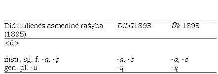 1 lentelėje parodyta, kuo Didžiulienės asmeninė rašyba skyrėsi nuo DiLG1893. Matyti, kad DiLG1893 pasirinktas Ūk ortografijos variantas3.