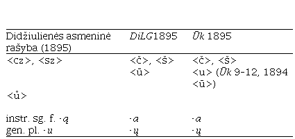Taigi DiLG1895 nuo asmeninės Didžiulienės rašybos skyrėsi dar labiau negu DiLG1893 – nevienodai žymėta ne tik [uo] ir [v] bei instr. sg. f. ir gen. pl. galūnės, bet ir [č], [š], [u͘ ]. Vadinasi, iš šių knygų negalima spręsti apie autorės ortografiją: ji rašė baranauskiškai, o knygų rašyba derinta prie Ūk.