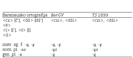 Antano Baranausko, sukūrusio savo rašomosios kalbos modelį, knygų ortografija jau yra analizuota (Venckienė 2015, 100–120), tačiau čia prisimintina 1899 m. TS išleista jo knyga Graudųs Verksmai ir kitos naujosios giesmės .TS Nr. 2 priedas; toliau – BarGV). Leidimą parengė tuometis TS redaktorius Tumas. Knygoje liko tik tos Baranausko ortografijos ypatybės, kurios atitiko laikraščio kalbos modelį: rašmenys <cz>, <sz> (szvencziausį 32), vardažodžių instr. sg. f. ir iness. pl. formos su nosinį balsį žyminčia raide galūnėje (instr. sg. f. su Bažnyczią 21; iness. pl. Aszarosę 3, Rasztuosę 19). Tačiau Baranausko raidžių <ë> [ie], <ů>, <l> [l’], <ł> [l], <w> BarGV nebuvo, plg.: szviesa 3, Bucziuoja 5, Aniolai 3, nuliudę 3, svietę3; jos nevartotos ir TS. Be to, knygoje, kaip ir TS, žymėtas [č], [dž] minkštumas, plg.: Bažnyczią 21, žodžiai 23, nors Baranauskas jo nežymėjo.