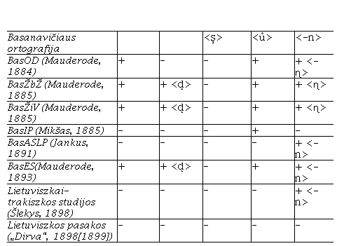 Savo ortografijos inovacijas – <t̹> (aukštaičių [č], žemaičių [t]) ir <-ɳ> nosiniams balsiams žymėti (<aɳ, eɳ, iɳ, uɳ>), Basanavičius pirmą kartą pristatė ir pademonstravo 1884‑aisiais Otto von Mauderode’s išspausdintoje knygoje Oškabaliun dainos (toliau – BasOD). Be jų, vartota ir <ů> [uo] (Oškabaliůs 3)5.