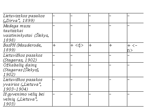 Kas link rašybos – man malonu būtų, kad jas su mano liter. d̹, t̹ ir n in accus. sing. et gens. plural. spausdintumėt; bet tų literų neturint, galite jas spausdinti „Vienybės“ rašyboje. Iš priežasties rašybos mums susipykti neteks (Basanavičius 1897-01-09, 4).