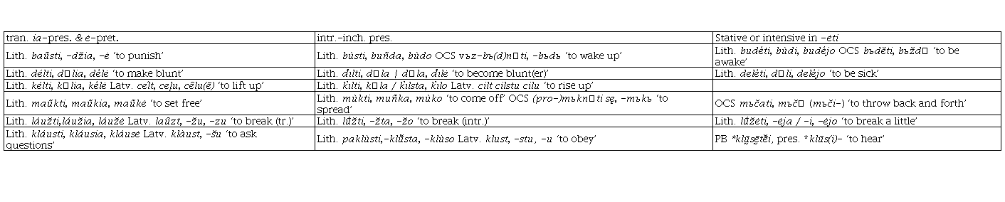 The table below shows the common Baltic pairs of transitive verbs in ia-presents and .-preterits and intransitive-inchoative verbs in either nasal presents or sta-presents (cf. Stang 1942, 124–125; Endzelīns 1951, 764–765). In addition, stative or intensive formations in -ėti based on the respective verbal roots in the table are quoted when available. The pattern is partially paralleled by Slavic verbs as supplemented with OCS forms.