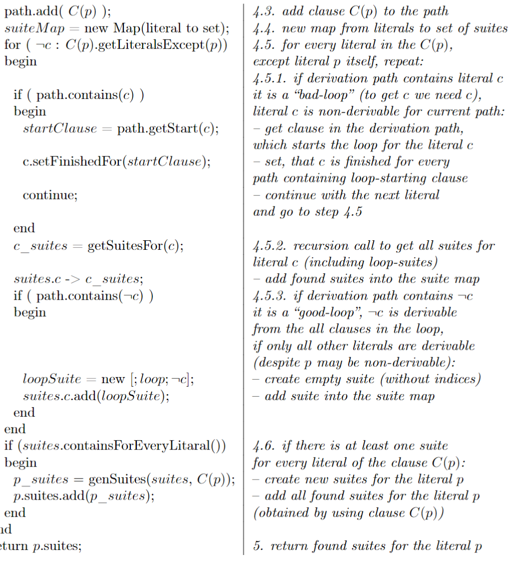 Now we introduce helper suite generation procedure genSuites(suiteMap,C(p)). It generates suites for the literal p from suites of the literals containing in the same clause.