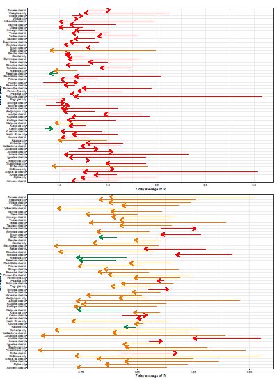 From the top Fig. 3 we can see that the has lowered in 47 out of 60 municipalities and even decreased below 1 in 5 municipalities (orange arrows) when the second quarantine was applied in 07/11/2020. Indeed, the decrease of was wider spread only when the internal movement ban was applied in 16/12/2020: has diminished in 45 out of 60 municipalities and it has decreased below 1 in 44 out of 60 municipalities (orange arrows at the bottom in Fig. 3). During the period from 16/12/2020 till 02/02/2021 the has decreased for 5 municipalities in which the value was below 1 at the beginning of this period (green arrows at the bottom Fig. 3). In this figure arrows directed to the right and left are showing whether the reproduction number was increasing or decreasing, accordingly, during this period. The green colour shows municipalities that had below 1 at the beginning and have it at the end of the period; orange colour marks municipalities that had above 1 at the beginning and has decreased below 1 at the end of the period; red colour shows where did not decrease below 1 in all periods.