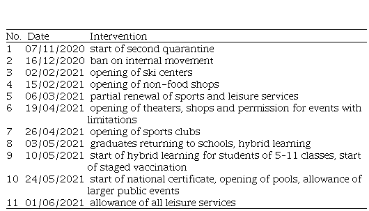 Figure 1 shows the dynamics of 7-day reproduction number median (black curve) with 95% credible interval (blue curves). The red and gray tiles in the background show whether the eight NPIs (listed on the right side of the graph) were applied (On – red background color)/not applied (Off – gray background color) at the specific moment in time. Red vertical lines mark the added governmental restrictions, while green vertical lines show the days when governmental restrictions have been relieved. Red horizontal dashed line marks . The descriptions of nationwide governmental interventions marked with numbers and vertical lines in this figure can be found in Table 1.