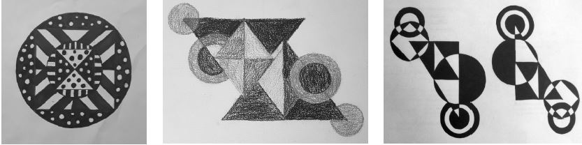 Atlikus matematinę užduoties dalį, gautas geometrinių figūrų dvimatėje erdvėje brėžinys buvo panaudotas dailės pamokos daliai, kuriai pasirinktomis priemonėmis (paprastu pieštuku, juodu tušu, juodu šratinuku) jis buvo meniškai dekoruojamas. Linijomis (storomis, plonomis, retomis glaustomis), taškais (mažais, didesniais, už- tušuotais, retais, tankiais, didėjančiais, mažėjančiais), šešėliuojant atskirus plotus, geometrinių figūrų dalis ar ištisas geometrines figūras stengiamasi sukurti trimatę iliuziją (2 pav.).