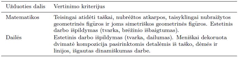 Daile˙s Estetinis darbo išpildymas (tvarka, dailumas). Meniškai dekoruota dvimate˙ kompozicija pasirinktomis detale˙mis iš taško, de˙me˙s ir linijos, išgautas dinamiškumas darbe.