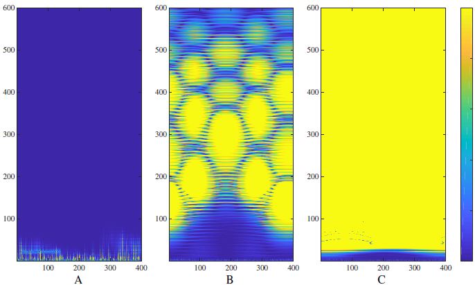 Keičiant parametro reikšmes, matomos visos trys tinklo elgesio būsenos (1 pav.). Paveikslo A dalyje matomas tinklo užgesimas ir papildomos komponentės reikšmė tampa lygi 0. Šį elgesį stebime fiksuodami parametro reikšmę Didinant parametro reikšmę iki 0,506 gaunama divergavimo chimerų būsena, t.y., suformuojami raštai, primenantys korius (1B pav.). Kai siejimo parametras – stebimas stai- gaus divergavimo efektas (1C pav.). Reiktų pastebėti, kad siejimo rangas visais trim atvejais yra pastovus. Matoma, jog keičiant vos vieną parametrą, galima stebėti, kaip tinklas pereina visas tris būsenas.