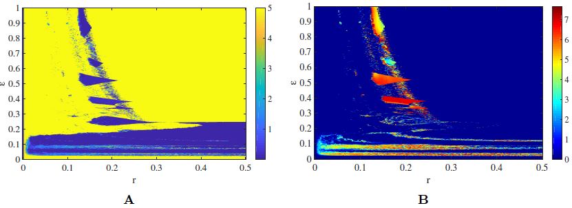 Kai tinklo parametras o pradinės sąlygos generuojamos atsitiktinai, gaunamas 2A paveikslas. Tinklo užgesimą lemiančios parametrų sritys žymimos mėlyna, o divergavimą – geltona spalva. Divergavimo chimeras nusako spalvos esančios tarp tamsiai mėlynos ir geltonos. Siekiant ištirti tinklo elgesį visoje ir parametrų plokštumoje, pakanka tiesiog skaičiuoti vidurkius (2A pav.), tuo tarpu siekiant labiau išryškinti chimeras lemiančias parametrų sritis, paranku naudoti vaizdo entropiją, kuri kaip ir vidurkiai skaičiuojama paskutinių 300 iteracijų sugeneruotam vaizdui įvertinti (2B pav.). 1 paveiksle pateiktų grafikų vidurkių reikšmės, kai (A dalis), (B dalis) ir (C dalis) yra atitinkamai lygios 0, 1,47 ir 5, o entropijų reikšmės – atitinkamai 0, 2,48 ir 0.