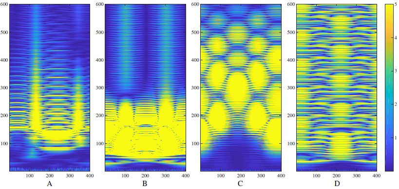 Ypatingą dėmesį reiktų skirti divergavimo chimeroms – tinklo būsenai, kai gęstantys ir diverguojantys procesai persipina, suformuodami raštus. Kai pradinės sąlygos yra generuojamos atsitiktinai, parametrai ir išlieka fiksuoti ir atitinkamai lygūs ir , o keičiamos tik reikšmės galime stebėti divergavimo chimerų įvairovę (3 pav.). Siejimo parametro reikšmės paveikslo A, B, C ir D dalyse atitin- kamai lygios 0,35, 0,418, 0,506 ir 0,576, o entropija įgyja reikšmes, lygias 6,68, 3,43, 2,48 ir 0,4. Kuo didesnis atsitiktinumas fiksuojamas vaizde, tuo didesnė vaizdo ent- ropija. Akivaizdu, kad keičiant vos vieną parametrą galima stebėti skirtingus raštus formuojančias chimeras.