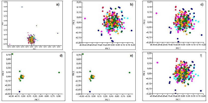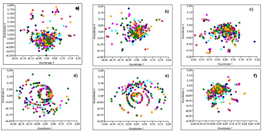 Atlikus tyrimus paaiškėjo, kad taikant daugiamačių skalių metodą, paklaidos funkcijos reikšmės apytiksliai lygios, kai naudojame Euklido, Gower , Bray-Curtis ir Morisita atstumus. Naudojant Kulczynski atstumą paklaidos funkcijos reikšmė – 1,070. Paklaidos funkcija įgyja mažiausią reikšmę, kai taikome Jaccard atstumą (1 pav.). Rezultatai, gauti taikant pagrindinių komponenčių metodą, pateikti antrame paveiksle. Kai panašumo matas yra Euklido atstumas, pirma pagrindinė komponentė paaiškina 0,57%, antra genetinės įvairovės duomenų. Taikant Gower Bray-Curtis ir Morisita pirmos dvi pagrindinės komponentės paaiškina beveik vienodai genetinės įvairovės. Pirma ir antra pagrindinės komponentės, taikant Kulczynski ir Jaccard artimumo matus, kurios paaiškina 22, 60% genetinės įvairovės, parodė, kad asmenys iš šešių Lietuvos etnolingvistinių grupių suformuoja vieną bendrą klasterį, tačiau matomas ir tam tikras taškų išsibarstymas (2b pav., 2c pav., 2f pav.).