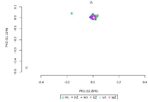 Tą pačią tendenciją galime pastebėti, kai duomenų vizualizavimui taikome pag- rindinių komponenčių metodą, o panašumo matas yra Euklido atstumas (3 pav.). Tiek DS, tiek PK metodu gauti taškai yra labiau išsibarstę, kai artimumo matas yra Gower, Bray-Curtis ir Morisita, todėl sunku įvertinti populiacijos genetinę struktūrą.