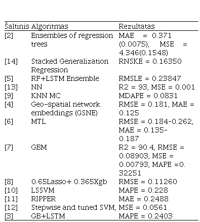 Darbe buvo stengtasi į būsto kainos prognozavimo uždavinį pažiūrėti iš įvairių pusių: kaip regresinį uždavinį, BKI ir kaimynų uždavinius, giliojo mokinimosi uždavinį, daugiaužduotinį uždavinį ar kaip laiko eilutes. Apžvelgtų darbų rezultatai yra pateikiami 1 lentelėje. Svarbu paminėti, jog darbuose skyrėsi modelio vertinimo kriterijai, todėl buvo pateiktos įvairios metrikos.
