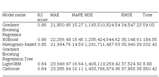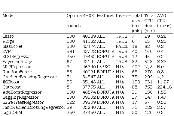 Kadangi darbe bus naudojama regresija, bus taikomi pagrindiniai metodai naudoti literatūros apžvalgoje. Daugiausia šių modelių yra medžių šeimai priklausantys modeliai, tačiau papildomai panaudoti ir tiesiniai modeliai, kurie nors ir nėra tokie galingi kaip pastarieji – vis dėl to yra vertinami versle iki dabar dėl paprasto interpretuojamumo ir paaiškinamumo. Šalia šių dviejų modelių šeimų taip pat bus panaudota artimiausių kaimynų regresija, vienas NN modelis ir įvairių modelių ansambliai. Visi naudoti modeliai pateikiami 2 lentelėje.