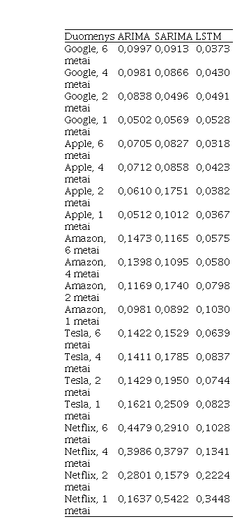 LSTM prognozės yra tiksliausios visoms tirtoms laiko eilutėms, kas patvirtina Siami-Namini et al. išvadą: “giliuoju mokymusi pagrįsti algoritmai, tokie kaip LSTM, pranoksta tradicinius algoritmus, tokius kaip ARIMA modelis” [13]. Priešingai ARIMA rezultatams, LSTM prognozės yra geriausios ilgiausiuose intervaluose (6 metai, žr. 1 pav.).