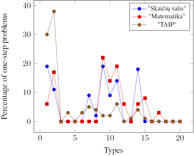We studied three first grade textbooks: “Skaičių šalis”, B. Balčytis, A. Vaičiulienė, 1992. “Matematika 1 klasei”; A. Kiseliovas, D. Kiseliova, 2016. “TAIP!”; Rita Rimšienė, Ada Kavaliauskienė, Linas Vilčinskas, Šviesa, 2018. Me and Rimas Nor-vaiša studied these three textbooks separately and then compared results and cameto an agreement for each task type. You can see classified S problems in Fig. 2. Asyou can see there are no word problems for some types.