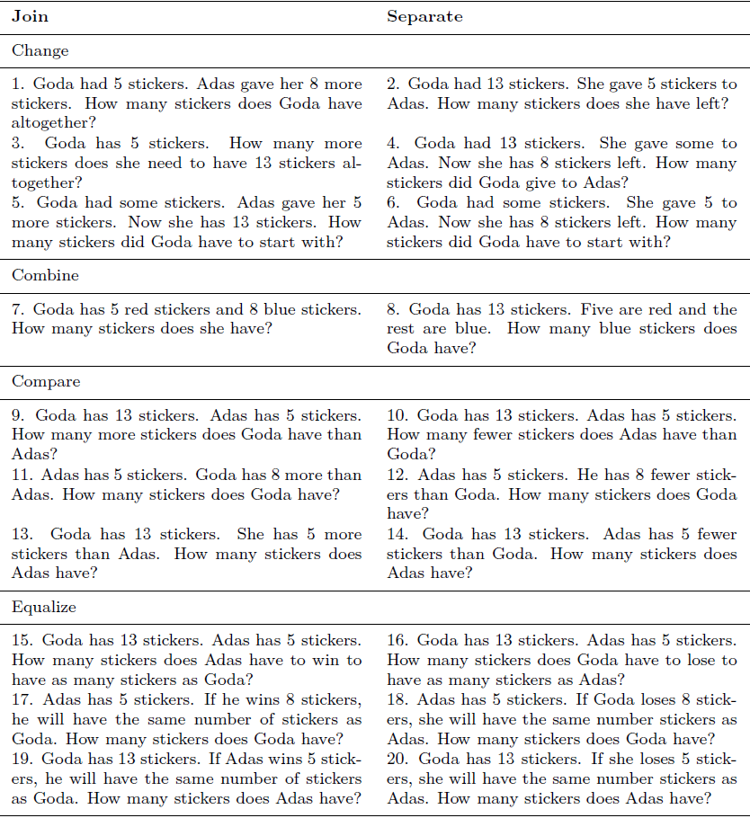 We divided S1 problems into 20 types from [7] (Table 1). It is just one example of many classifications, which can show what word problems we have.