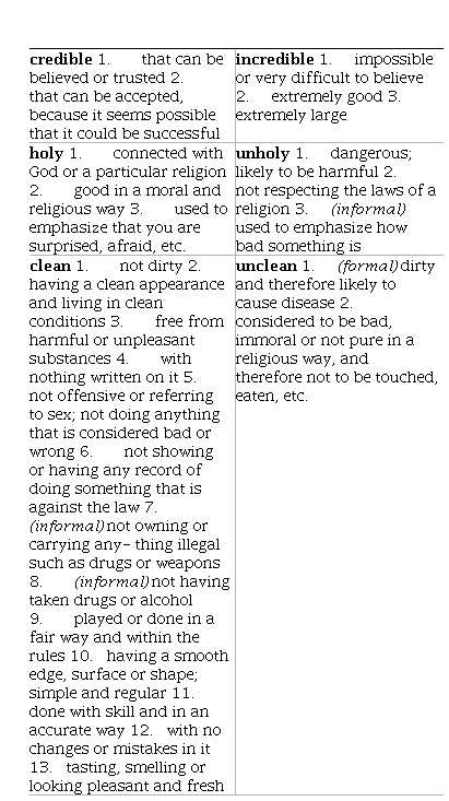1 lentelėje pateikiamos trijų būdvardžių ir jų neigiamųjų derivatų reikšmės iš Oksfordo mokomojo žodyno Oxford Advanced Learner’s Dictionary (OALD). Prie būdvardžio credible ‚tikėtinas, patikimas‘ pridėjus neigimo priešdėlį intik ši – t. y. pirmoji – jo reikšmė atsispindi neigiamojoje jo formoje ‚neįtikėtinas, neįtikimas‘. Antroji teigiamosios būdvardžio formos reikšmė ‚priimtinas, tinkamas‘ neišlieka neigiamojoje būdvardžio formoje. Tuo pat metu neigiamoji forma incredible įgyja naujas (antrąją ir trečiąją) reikšmes ‚nuostabus, nepaprastas, milžiniškas‘, kurių neturi teigiamoji forma.