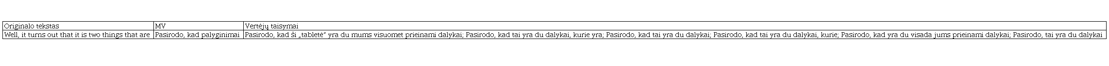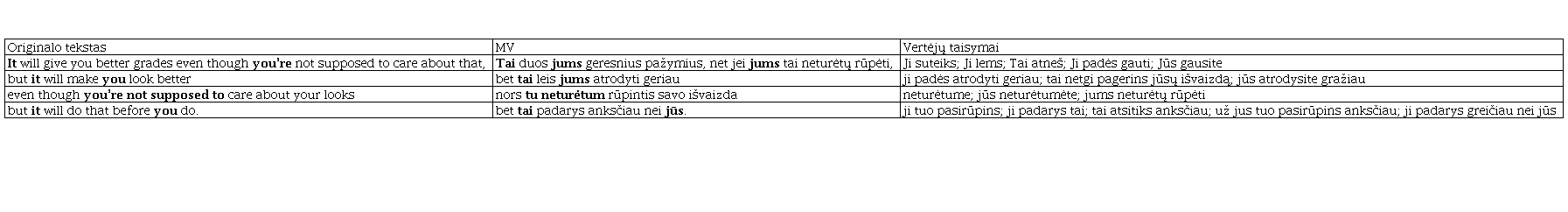 MV sistemos apdorotame tekste pasitaikė nesuderintų linksnių, skaičiaus, asmens ir giminės atvejų, tačiau visi atvejai, išskyrus vieną, tikėtina, atsirado dėl teksto segmentavimo. Šis atvejis, kuriam įtakos segmentavimas neturi, nors ir neteisingas, neturėtų būti laikomas MV klaida, nes tik iš to, kad ekrane kalba moteris, galima spręsti, jog versti reikėjo kitaip. MV sistema tokio konteksto negali žinoti.