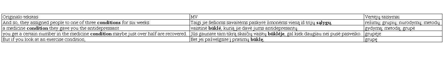 Atskiras daugiareikšmiškumo atvejis – terminų vartojimas. Šioje ištraukoje profesorė keturis kartus paminėjo terminą condition, kalbėdama apie eksperimento tiriamųjų grupes. MV sistema vieną kartą pateikė vertimą sąlygų ir tris kartus – būklė. Ši klaida galėtų būti skaičiuojama kaip viena, nes tai vienas ir tas pats terminas, tačiau pasirinkta skaičiuoti visus 4 atvejus atskirai, nes MV tą patį terminą vertė skirtingai, o vertėjai skirtingai jį taisė ir nesilaikė nuoseklumo reikalavimų. Pažymėtina, kad tik 2 vertėjai spėjo postredaguoti visas keturias eilutes.