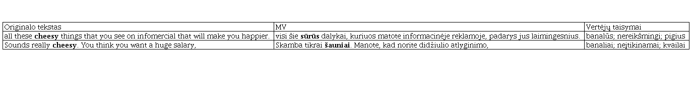 Idioma cheesy ištraukoje kartojasi du kartus. MV pateikia du skirtingus vertimus, tačiau abu nėra tinkami, neatsižvelgiama į kontekstą. Reikėtų paminėti, kad visi – tiek profesionalūs, tiek neprofesionalūs – vertėjai siūlė savo taisymus, tačiau ne visi taisymai būtų laikomi teisingais.