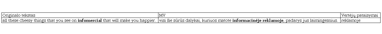 Kitas įdomus laisvųjų pasirinkimų atvejis – termino infomercial vertimas. Du profesionalūs vertėjai pasirinko ištaisyti MV siūlytą terminą informacinė reklama į tiesiog reklama, tačiau to daryti nereikėjo, nes terminas informacinė reklama vartojamas srities specialistų ir apibrėžtas Lietuvos komunikacijos agentūrų asociacijos KOMAA5.