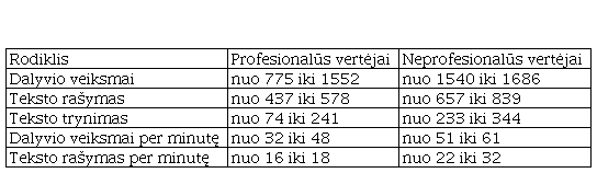 Išnagrinėjus „Translog-II“ pateiktus statistinius duomenis apie postredagavimo procesą, klavišų paspaudimus ir keitimus, galima įžvelgti profesionalių ir neprofesionalių vertėjų aktyvumo skirtumų (1 lentelė). Duomenys rodo, kad neprofesionalūs vertėjai atliko daugiau veiksmų ir parašė daugiau teksto. Jie taip pat daugiau taisė. Tai reiškia, kad neprofesionalūs vertėjai skyrė daugiau techninių pastangų nei kognityvinių. Tai gali būti ir patirties trūkumo rodiklis, kai vertėjas abejoja savo sprendimais ir ieško tinkamo varianto iš karto rašydamas ir taisydamas tekstą, o ne gerai apsvarstęs.