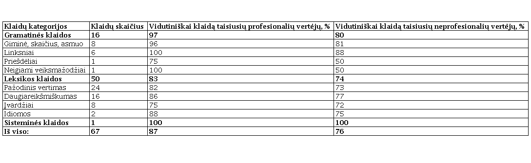Kadangi ne visi vertėjai postredagavo visas eilutes, 3 lentelėje pateikiami vidutiniškai klaidą taisiusių vertėjų rodikliai. Kaip matyti, visi profesionalūs vertėjai ištaisė tik linksnių klaidas ir vieną neigiamo veiksmažodžio atvejį, kitas klaidas taisė ne visi vertėjai. Duomenys rodo, kad neprofesionalūs vertėjai taisė mažiau visų kategorijų klaidų. Didžiausias skirtumas – giminės, skaičiaus, asmens kategorijoje: profesionalūs vertėjai vidutiniškai taisė 96 proc. atvejų, o neprofesionalūs vertėjai – 81 proc.; mažiausias – taisant įvardžių klaidas: profesionalūs vertėjai vidutiniškai taisė 75 proc. atvejų, o neprofesionalūs vertėjai – 72 proc.